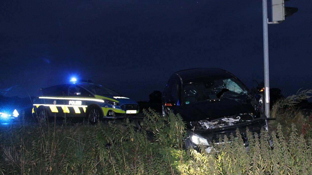 Nach der Kollision mit dem Lastwagen wurde der Mercedes gegen einen Ampelmasten geschleudert. | © Polizei Minden-Lübbecke