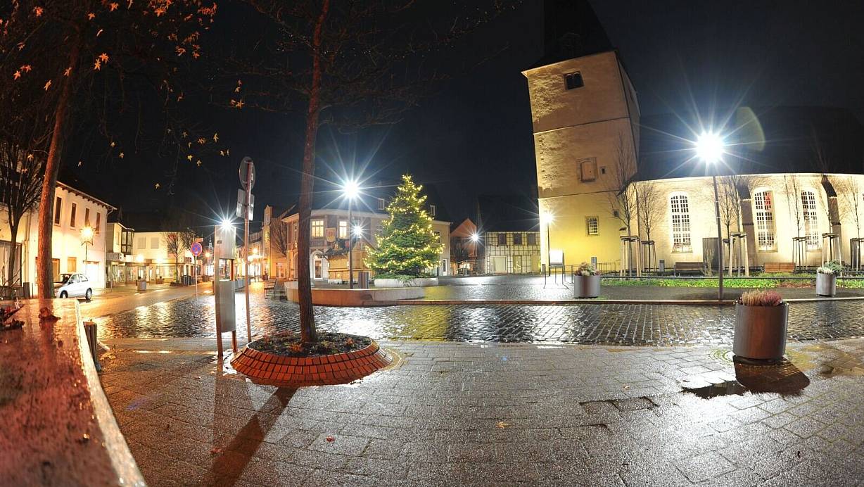 Der Platz an der St.-Johannis-Kirche in Rahden ist das Zentrum der Stadt. Während der Ausgangssperre um Weihnachten leuchtete der Weihnachtsbaum einsam und verlassen auf dem Kirchplatz. | © Joern Spreen-Ledebur