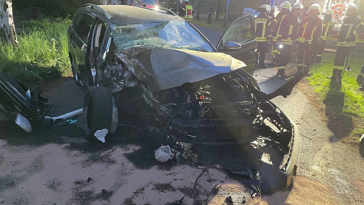 Der Passat hatte eine Kurve wohl nicht mehr bekommen und ist dann fast geradeaus gegen einen Baum gefahren. Das Auto wurde dabei stark beschädigt, drehte sich noch um fast 180 Grad und war dann mitten auf der Straße zum Stehen gekommen.