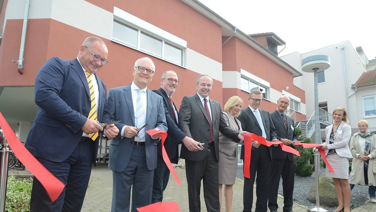 Das Band ist durchschnitten: Ende Oktober 2014 gaben Matthias Bracht (MKK; v. l.), Bernd Hachmann, Ernst-Wilhelm Rahe (SPD-Landtags-Mitglied), Ralf Niermann, Tanja Warda, Olaf Bornemeier (MKK) und Michael Fantini den Weg ins umgebaute Krankenhaus Rahden frei. | © Joern Spreen-Ledebur