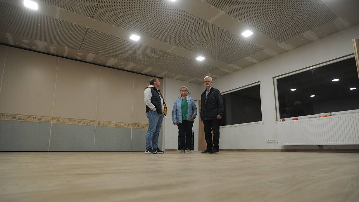 Auch Michael Duffe, Ortsheimatpflegerin Margret Windhorst und Günter Meyer freuen sich über die Fortschritte beim neuen Varler Dorfgemeinschaftshaus. Die Trennwand kennen viele Rahdener noch aus dem Steller "Ulmenhof". | © Joern Spreen-Ledebur