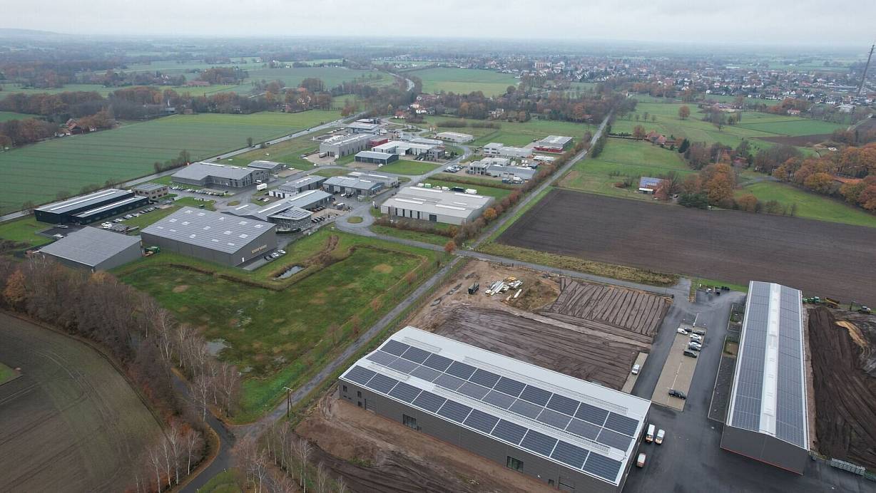 Die Stadt Rahden möchte das Gewerbegebiet Rahden-Süd erweitern - und zwar um eine Fläche, die von den Heinzig-Hallen (vorn rechts) und der Seufzeralle begrenzt wird. In dem Bereich gibt es noch eine Hofstelle mit fünf alten Eichen. | © Archiv Torsten Hagemann