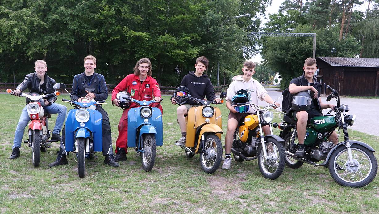 Fallen auf, wenn sie in der Gruppe mit ihren Simson-Mopeds unterwegs sind: Jost Rohlfing (v.l.), Jonah Moormann, Jan-Erik Titkemeier, Till Becker, Erik Borcherding und Mirko Meyrose. | © Sonja Rohlfing