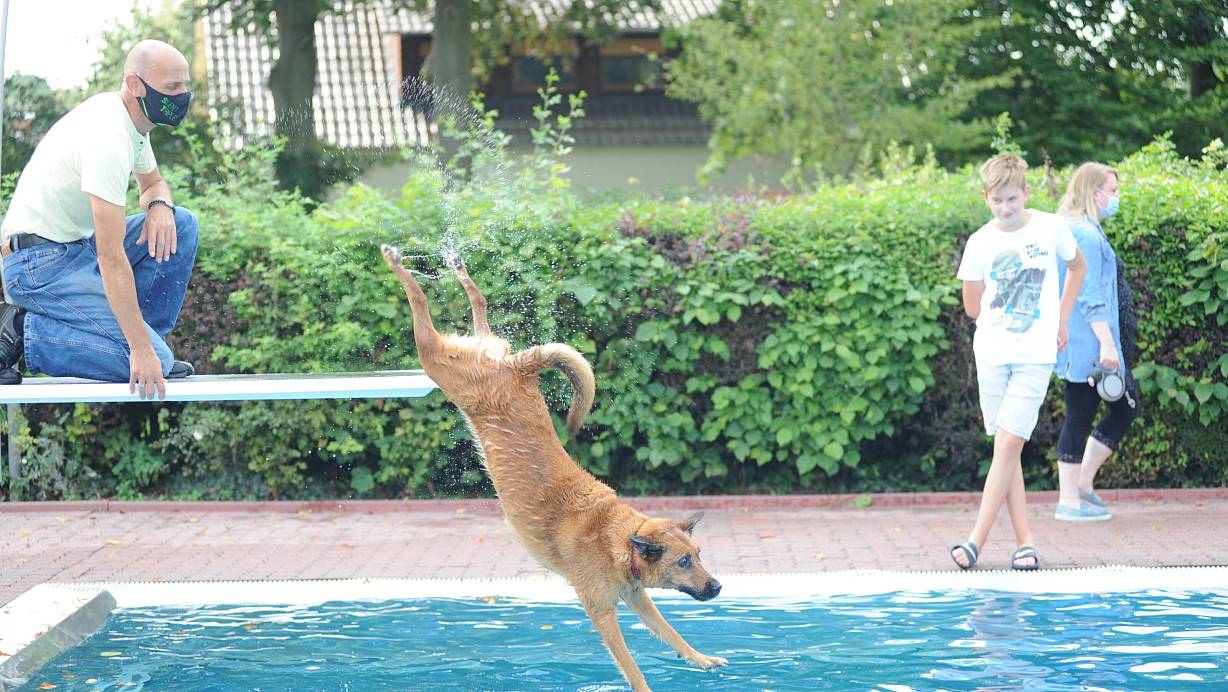 Vom Ein-Meter-Brett ins kühle Nass springen? Für Luna war das kein Thema. Die belgische Schäferhündin hatte ihre helle Freude daran. Hundeschwimmen im Freibad Rahden ist beliebt - und das Freibad ist eine freiwillige Leistung. | © Joern Spreen-Ledebur