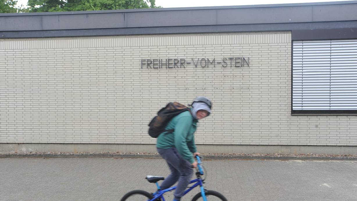 Der Namenszug an der früheren Rahdener Realschule ist nicht mehr vollständig. Von der Freiherr-vom-Stein-Realschule ist nur noch Freiherr vom Stein geblieben. Künftig kann sich die Stadt eine Nutzung des Gebäudes durch das Gymnasium vorstellen. Das lehnt das Gymnasium ab. | © Joern Spreen-Ledebur