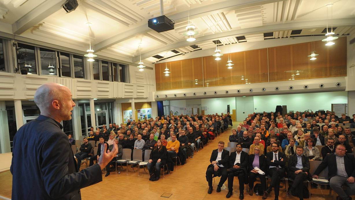 Carsten Lottner von der Beratungsgesellschaft DSK moderierte den Info-Abend der RWP im Gymnasium Rahden. Er freute sich ebenso wie RWP-Vertreter Sven Reimers über ein volles Haus. | © Joern Spreen-Ledebur