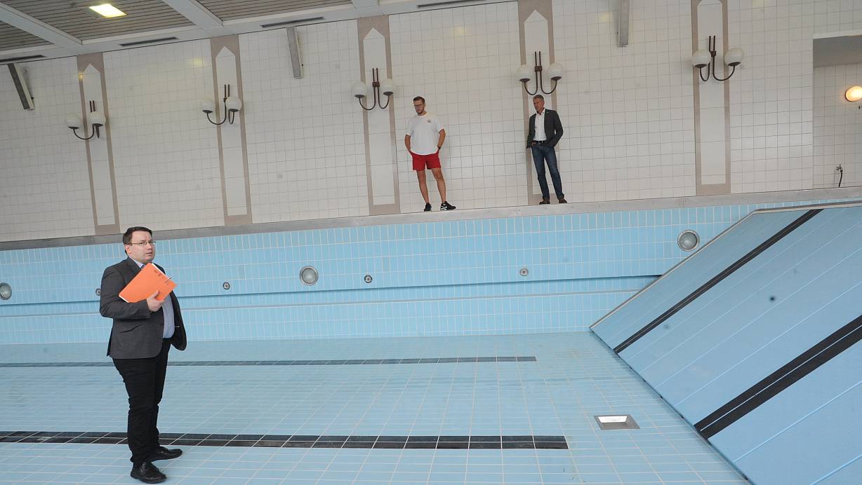 Vor drei Jahren war im Hallenbad ein neuer Hubboden eingebaut worden. Schwimmmeister Mike Fonas stellte die Technik damals auch Bürgermeister Bert Honsel und Werkleiter Christoph Flieder vor. | © Archiv Joern Spreen-Ledebur