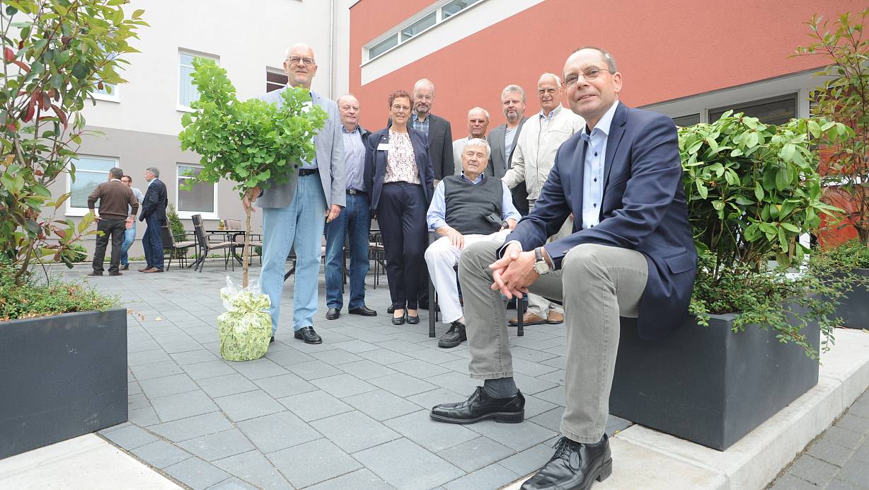 Im August 2017 freuten sich der Freundeskreis-Vorsitzende Clemens Eggensperger (vorn) ebenso wie seine damaligen und früheren Mitstreiter über die gelungene Terrasse an der Krankenhaus-Cafeteria in Rahden. Für die Maßnahme sorgte der Freundeskreis. | © Archiv Joern Spreen-Ledebur
