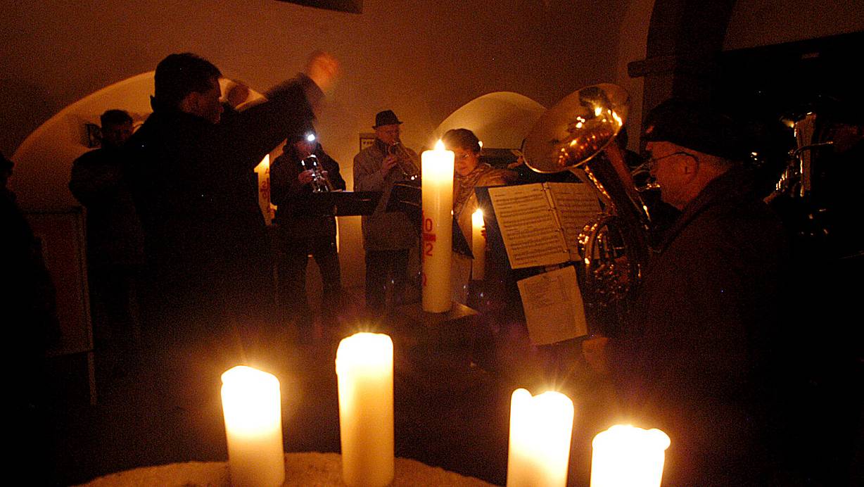 Der Rahdener Posaunenchor musizierte zum Auftakt des Weihnachtsmarktes am 25. November 2005 im Schein der Kerzen. Kurz vor der Eröffnung war in Rahden und Teilen Westfalens bei einem Wintereinrich der Strom ausgefallen. | © Archiv Joern Spreen-Ledebur