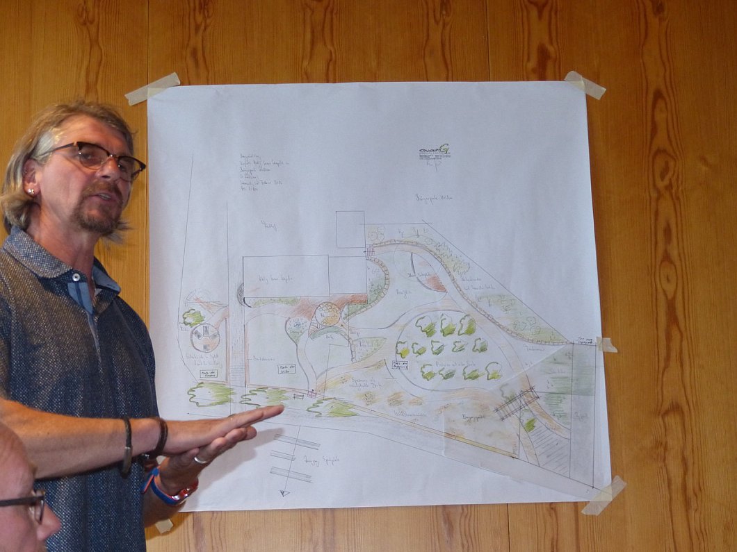 Thorsten Grabow hatte den Entwurf für die Gestaltung des Grundstücks ehrenamtlich erstellt. Seine Skizze sieht vor, das Gelände in drei Bereiche zu gliedern - jeweils einen für Begegnungen, Stille und Frieden. Den Platz der Begegnung prägen auf dem Entwurf eine Wiese mit Wildblumen, Obstbäume und Sitzgruppen.