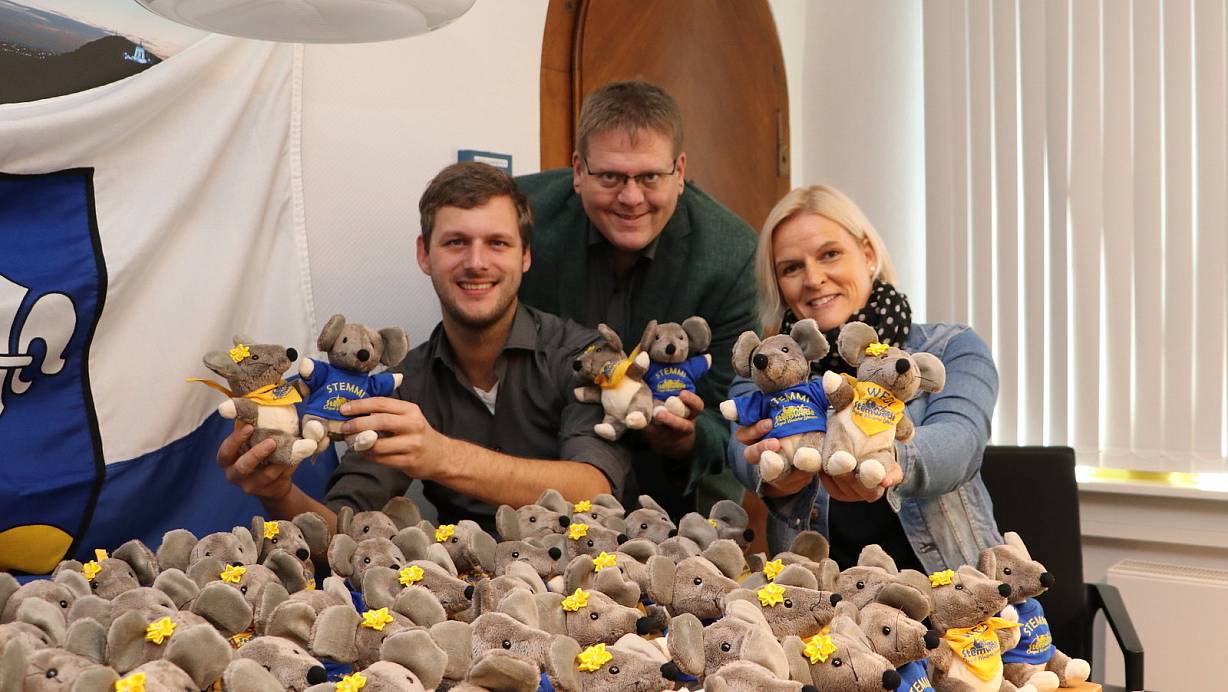 Stemwede. Das Plüschmäusepaar „Stemmi" und „Wedi" soll zukünftig für Stemwede werben. Die neuen Maskottchen stellten Bürgermeister Kai Abruszat und die Verwaltungsmitarbeiter Kirsten Halwe und Marcel Hahne im Rathaus vor. „Wo Mühlen und Getreide sind, da sind kleine Mäuse nicht weit. Darum war es klar, wer für Stemwede als liebenswerte Botschafter fungieren darf", sagt Kai Abruszat.