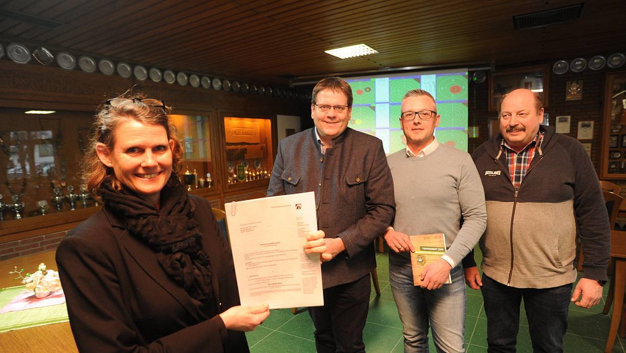 Regierungspräsidentin Judith Pirscher überreichte den Förderbescheid an Bürgermeister Kai Abruszat. Darüber freuten sich auch Matthias Spreen (Vorsitzender Schützenverein Oppenwehe) und Günter Sprado als Leiter des Landesleistungsstützpunktes Oppenwehe. | © Joern Spreen-Ledebur