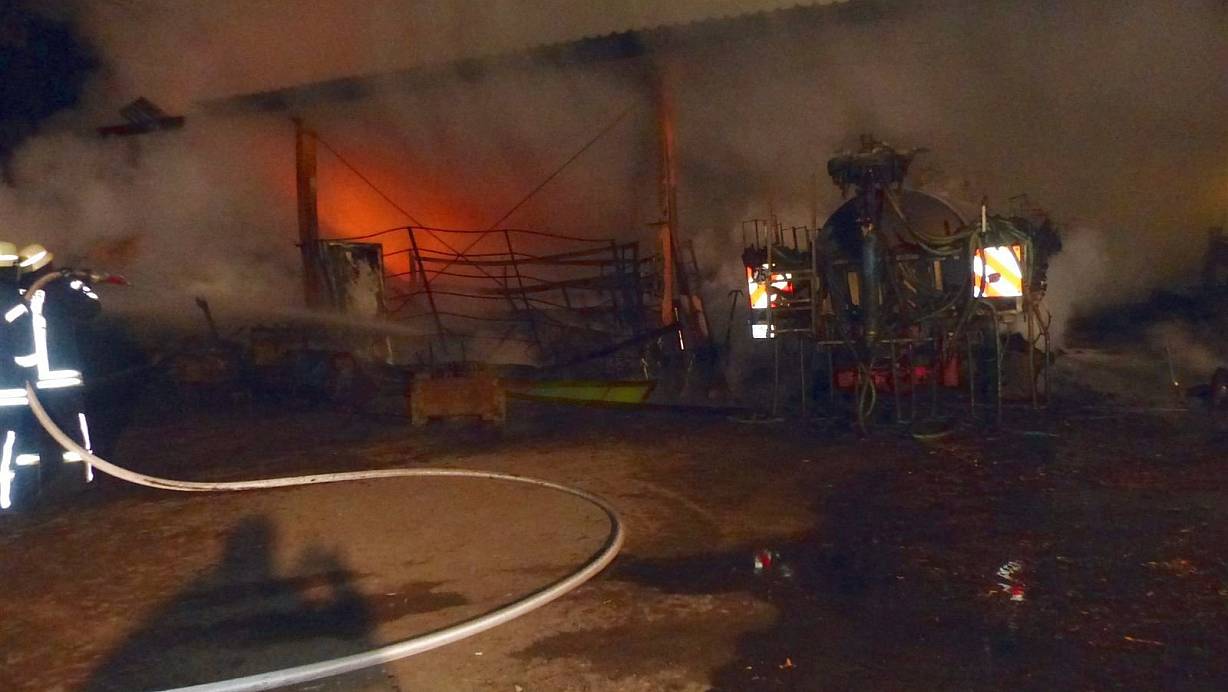 Die Feuerwehr mussten in der Nacht noch aus dem brennenden Gebäude die Strohballen mit einem Radlader heraus karren. Mittlerweile waren auch die Brandermittler vor Ort.