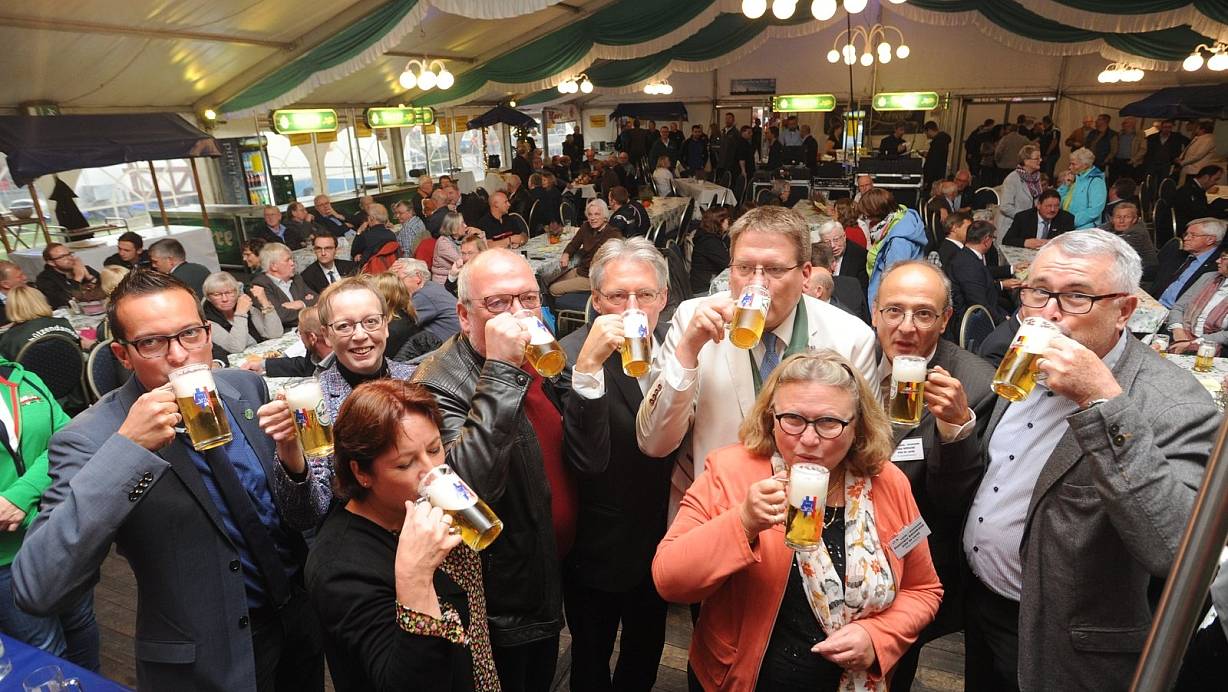 Ein Bild aus besseren Zeiten: Im Oktober stieß Bürgermeister Kai Abruszat mit der damaligen Regierungspräsidentin Marianne Thomann-Stahl, Politikern aus Bund und Land sowie seiner französischen Amtskollegin Dominique Bougraud auf den Leverner Markt an. | © Archiv Joern Spreen-Ledebur