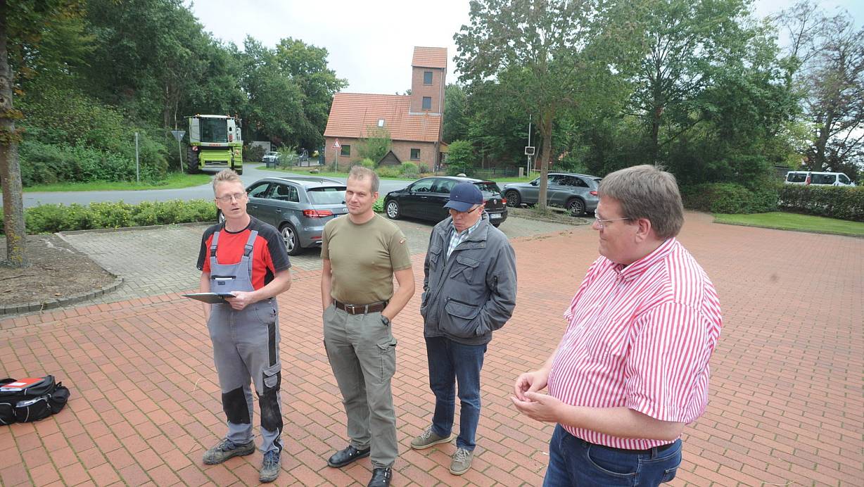 Während der Rundreise durch Stemwede machte Bürgermeister Kai Abruszat auch in Niedermehnen Station. Hier kritisierten Landwirte wie Hendrik Lahrmann und Christian Wehdebrock die auch vom Rat beschlossenen geplanten Aufpflasterungen vro der Kita. | © Joern Spreen-Ledebur