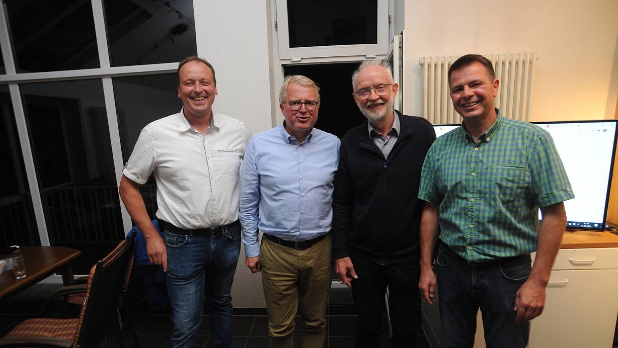 Der FDP-Kreisvorsitzende Frank Schäffler (2. v. l.) und sein Stemweder Kollege Wolfgang Fricke (3. v. l.) freuten sich: Lars Bunge (l.) und Dierk Möller-Nolting (r.) holten für die FDP Stemwede zwei Direktmandate im Rat. | © Joern Spreen-Ledebur