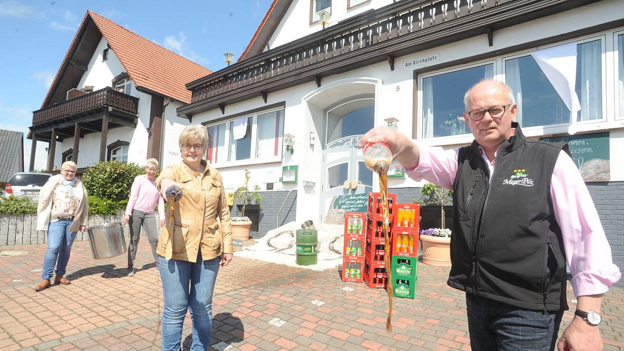 Die Stimmung in der Branche sei nicht gut, sagen Gastronom Rüdiger Meyer-Pilz und seine Kollegin Birgit Huck. Abgelaufene Getränke müssen sie wegschütten. Den Kochtopf, den Christiana Meyer-Pilz und Petra Schwennen halten, braucht es derzeit nicht. | © Joern Spreen-Ledebur