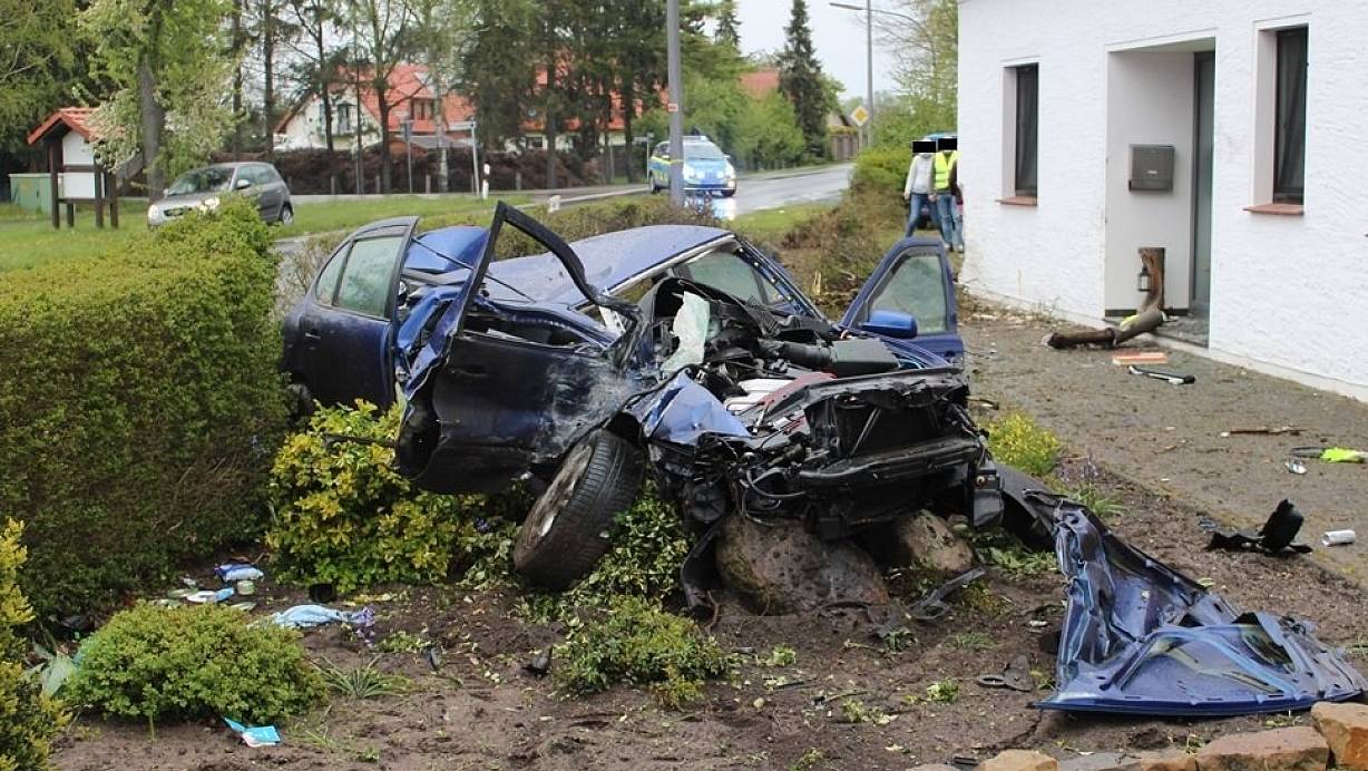 Dabei geriet das Fahrzeug mutmaßlich aufgrund nicht angepasster Geschwindigkeit auf nasser Fahrbahn außer Kontrolle, kam nach links von der Fahrbahn ab und prallte gegen eine Hauswand. In einer danebenliegenden Hecke endete dann die Fahrt. Ein geparkter Pkw wurde bei dem Unfall ebenfalls in Mitleidenschaft gezogen.