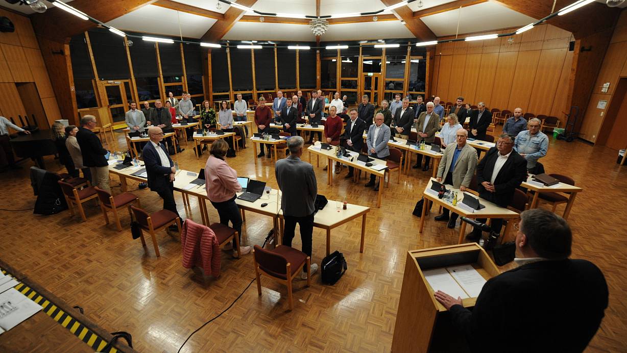 Die neue Sitzordnung im Stemweder Rat erinnert an die Sitzordnung aus einigen Landesparlamenten. Während ihrer Verpflichtung durch den Bürgermeister erhoben sich die Mitglieder des neuen Rates von ihren Plätzen. | © Joern Spreen-Ledebur