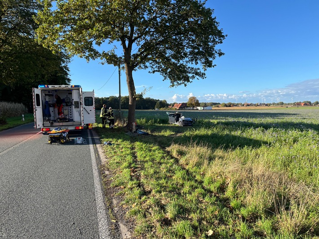 Aus bisher ungeklärte Ursache kam das Fahrzeug nach rechts von der Fahrbahn ab, prallte gegen einen Baum und wurde auf das angrenzende Feld geschleudert.