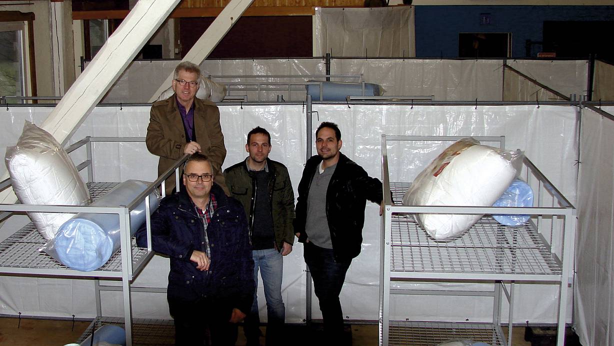 Kein Luxus, aber trocken und warm - Bürgermeister Hans Jürgen Wessels mit Kämmerer Markus Raabe und den Brüdern Marc und Ralf Höschen in der Notunterkunft im Kuhrausch |