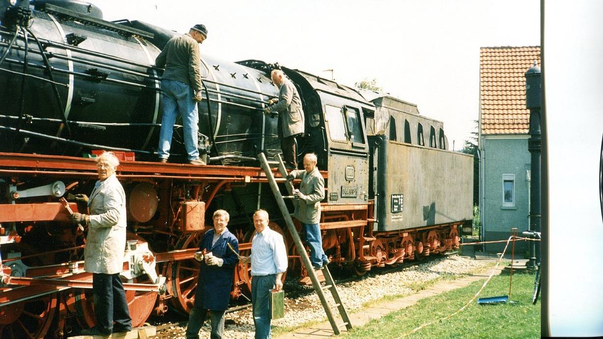Würden durchaus noch mal Hand anlegen: die früheren Mitarbeiter des Bahnbetriebswerks Altenbeken bei Restaurierungsarbeiten 1995 an und auf der Museumslok - (unten v. l.) Heinrich Schäfers, Christian Höschen, Rudolf Koch, Anton Moritz sowie (oben v. l.) Karl Winsel und Willi Dreier. | © Initiative Museumlok