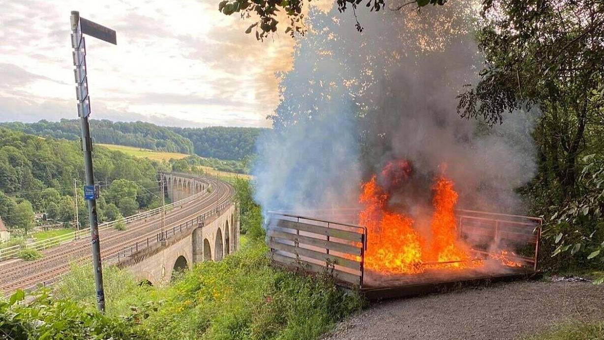 Altenbeken (nw/ber). Die Aussichtsplattform am Altenbekener Viadukt ist am Montagabend bei einem Feuer zerstört worden. Die Feuerwehr konnte ein Übergreifen auf den Wald verhindern. Die Ermittlungen der Kriminalpolizei haben ergeben, dass das das Feuer vorsätzlich gelegt worden ist.