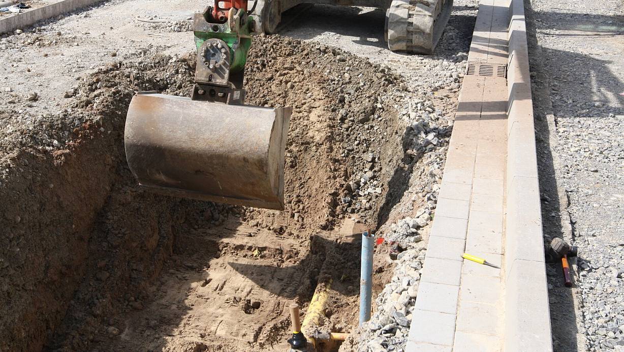 Ein Bagger hat bei Tiefbauarbeiten eine Leitung getroffen.
