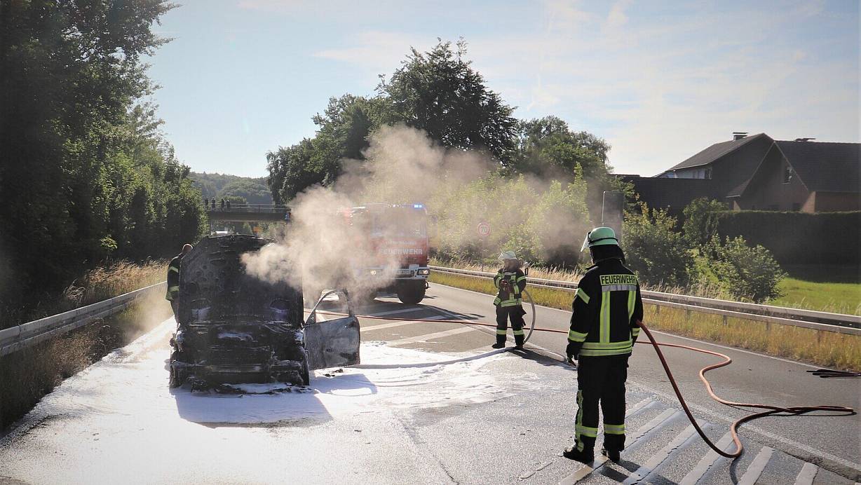 Altenbeken-Buke. Auf der Bundesstraße 64 ist am Mittwochmorgen ein Auto in Brand geraten und vollständig ausgebrannt, das berichtet die Paderborner Polizei.