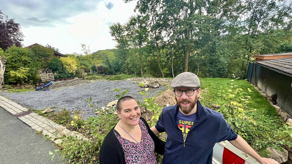 Christina und Daniel Platz an ihrem Altenbekener Grundstück, das für das Tinyhouse vorbereitet ist. | © Jens Reddeker