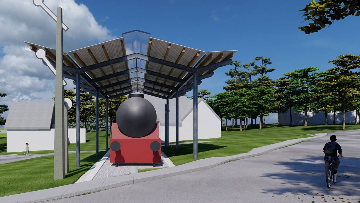 Diesen Entwurf einer Überdachung für das Altenbekener Dampflok-Denkmal hat das Paderborner Büro „Architektur-Werk-Stadt Balhorn Wewer Karhoff“ vorgestellt. Lok und Tender sind rund 22 Meter lang. | © AWS (Visualisierung)