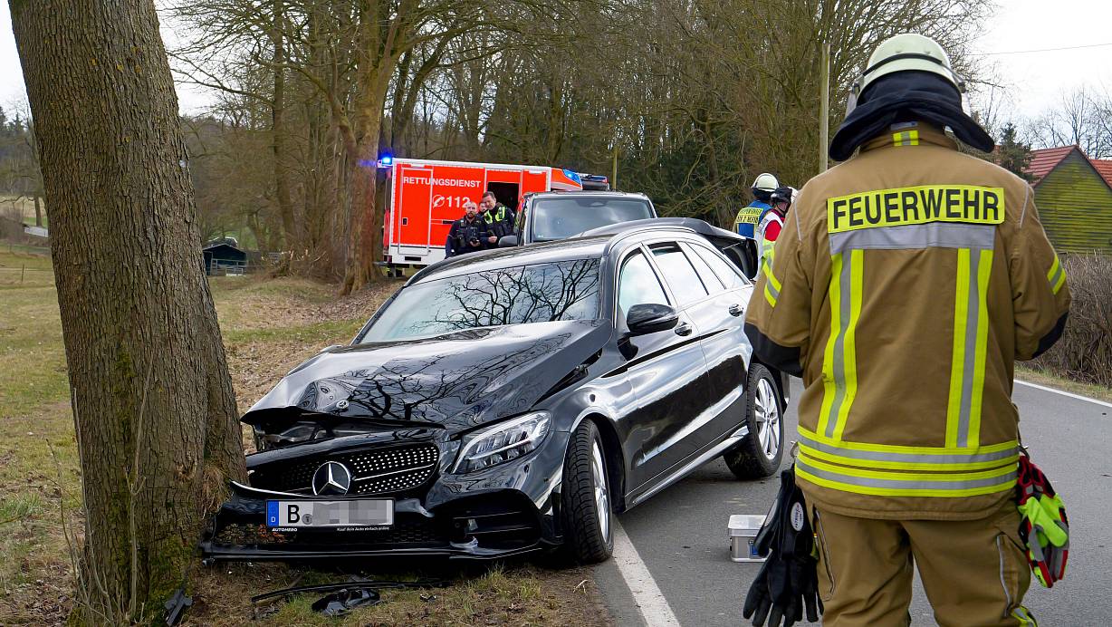 Ein Mercedes prallt auf der Neuenheerser Straße in Schwaney gegen einen Baum. Das Auto setzt einen automatischen Notruf ab, Feuerwehr und Rettungsdienst rücken aus.