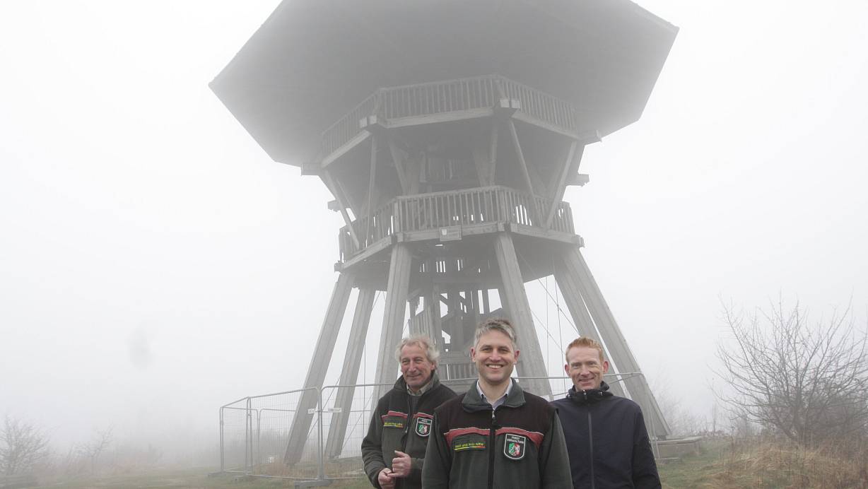 Bei typischem Eggewetter präsentieren Andreas Bathe (v.l.) und Matthias Berndt vom Landesbetrieb Wald und Holz NRW mit Christian Hecker (Hecker Holzsystembau GmbH), wie die Sanierung des Eggeturms finanziert und ausgeführt wird. | © Uwe Müller