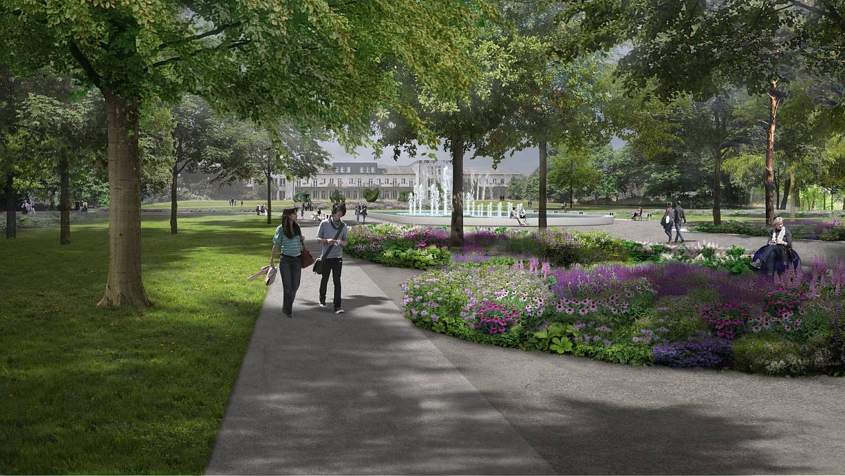 Eine Sichtachse bis zum Parkhotel: Vor dem Kaiser-Karls-Park (hinten) sind die zukünftigen Fontänen zu sehen. |