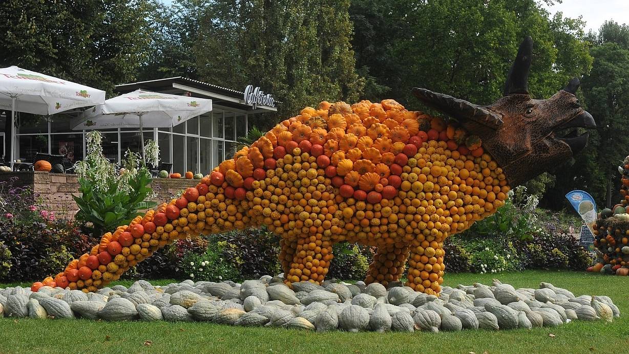 Hingucker: Mehrere Meter hoch sind die mit Kürbissen gestalteten Dino-Skulpturen. Der Unterbau besteht aus Holz. Dieses Exemplar stand im baden-württembergischen Ludwigsburg. | © Gartenschau Bad Lippspringe / Kuhnle