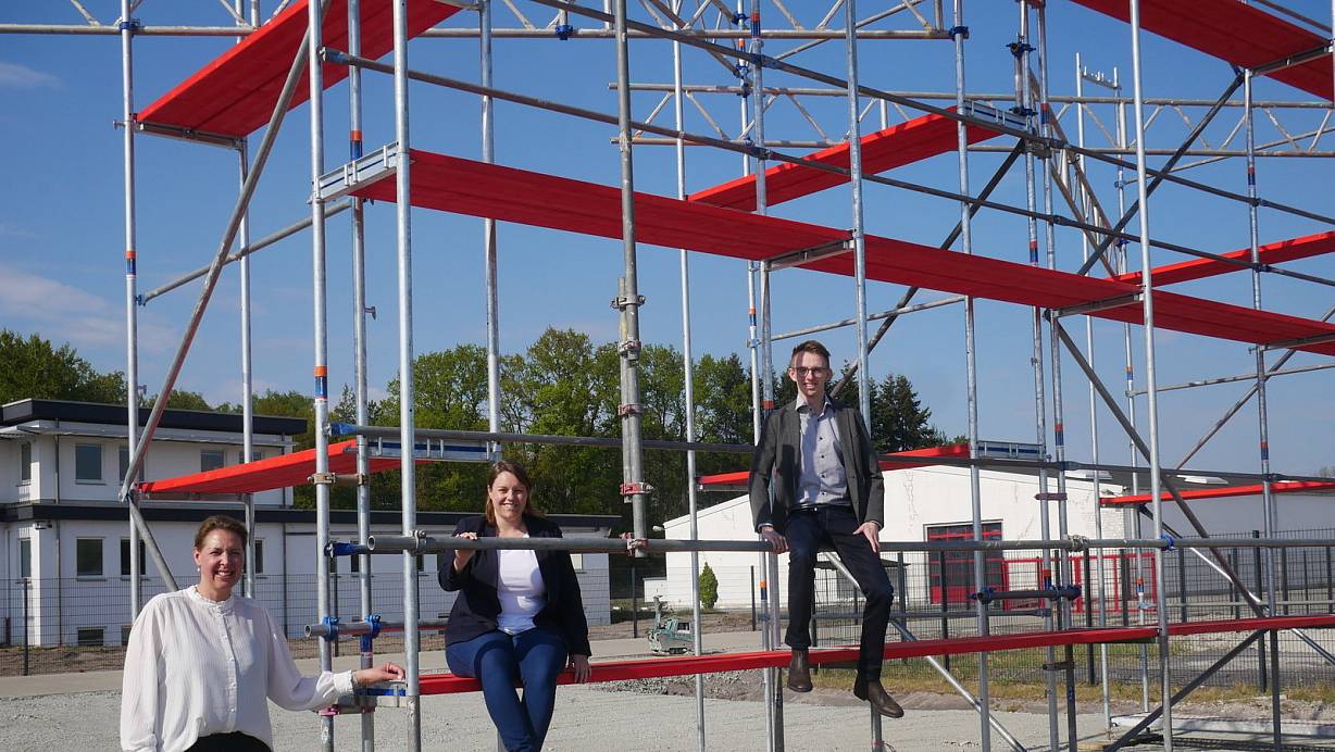 Iris Brockmeier (v. l.), Svea Ruhe und Max Weeke freuen sich auf die erste Vorstellung im Autokino Die 40 Quadratmeter große Leinwand soll an dem Stahlgerüst befestigt werden. | © Klaus Karenfeld