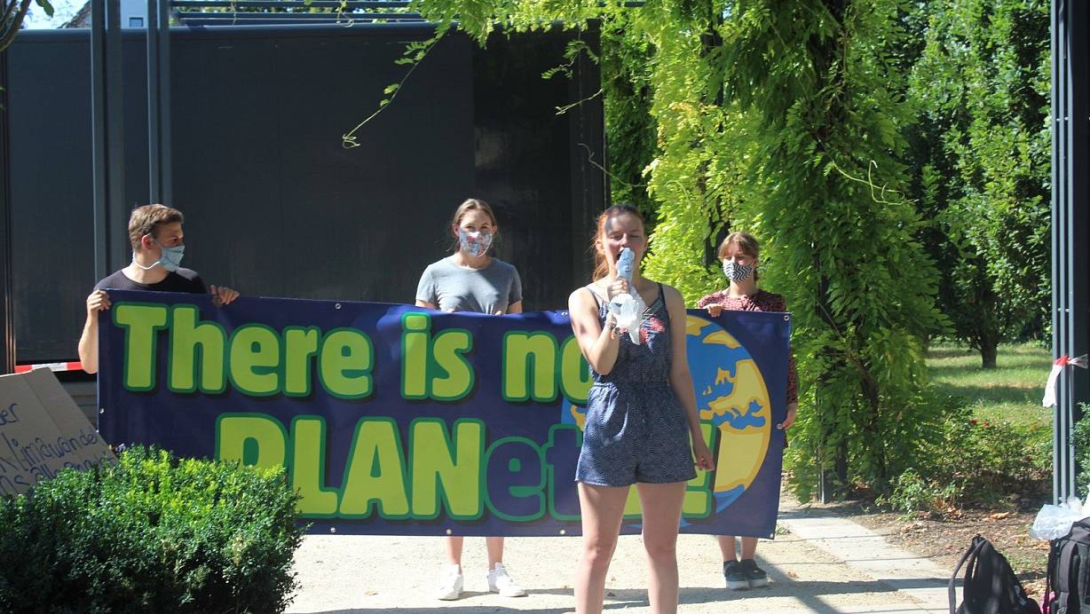 Fridays-for-Future-Aktivisten demonstrieren vor dem Rathaus. Sie fordern mehr Aufmerksamkeit für die Umwelt und weniger Interesse daran, was ein Klimanotstand für das Image der Kurstadt bedeuten könnte.