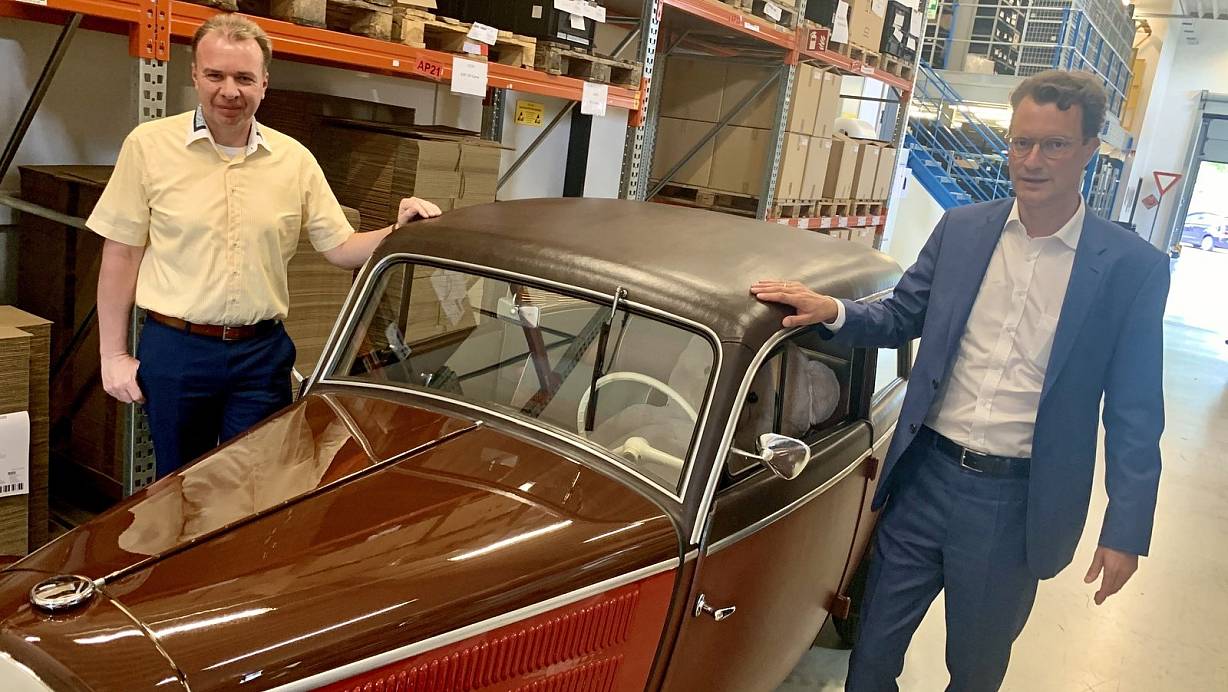 NRW-Verkehrsminister Hendrik Wüst (r.) staunt mit seinem CDU-Parteifreund Uli Lange über einen Oldtimer im Bad Lippspringer Unternehmen RTB von Rudolf Broer. Foto: Jens Reddeker | © Jens Reddeker