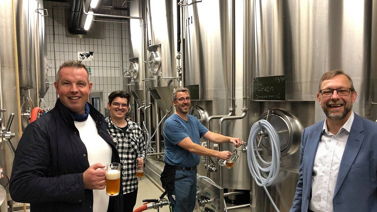 Ralf Eckel, Nils Gütthof (Josefs-Braumeister) sowie Guido Hentze, neue Mitinhaber der Josefs-Brauerei, und Gerhard Freund, Geschäftsführer des Josefsheim Bigge, stoßen mit einem frischen Märzen auf die Zusammenarbeit an. | © Josefsheim Bigge