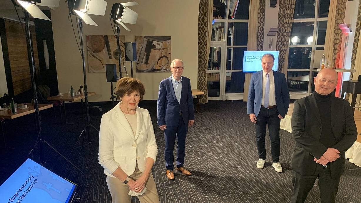 Vom Parkhotel aus stellten (v. l.) Initiatorin Sylvia Schubert, Moderator Manfred Müller, Bürgermeister Ulrich Lange und Berater Joachim Will die City-Outlet-Idee der Öffentlichkeit vor. | © Jens Reddeker