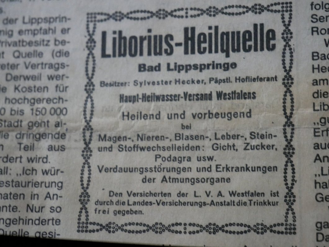 Wochen und Monate vergingen. Die Badestadt, und hier vor allem Hecker, wartete auf eine Antwort. Am 27. August 1911 konnte Heiner die erfreuliche Mitteilung machen, das Liboriuswasser sei dem Papst „gut bekommen". Diesen persönlichen Erfolg wusste Hecker natürlich auch geschäftlich zu nutzen. Eine neue Anzeigenkampagne wurde quasi über Nacht gestartet: „Liborius-Heilquelle Lippspringe, die haltbarste aller Lippspringer Quellen, im Gebrauche Sr. Heiligkeit Papst Pius X." Und es sollte noch besser kommen: Wenig später avancierte Hecker sogar zum „päpstlichen Hoflieferanten". Das Liboriuswasser hatte seine bis dahin erste große Bewährungsprobe bestanden.