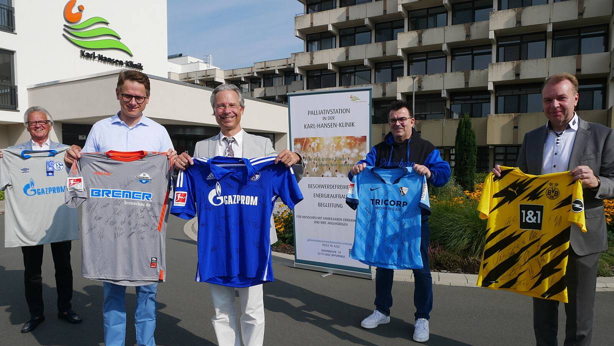 Versteigert werden unter anderem Trikots so bekannter Fußball-Bundesligisten wie Borussia Dortmund, Borussia Mönchengladbach, Arminia Bielefeld, VFL Bochum, des FC Schalke 04 oder des SC Paderborn.