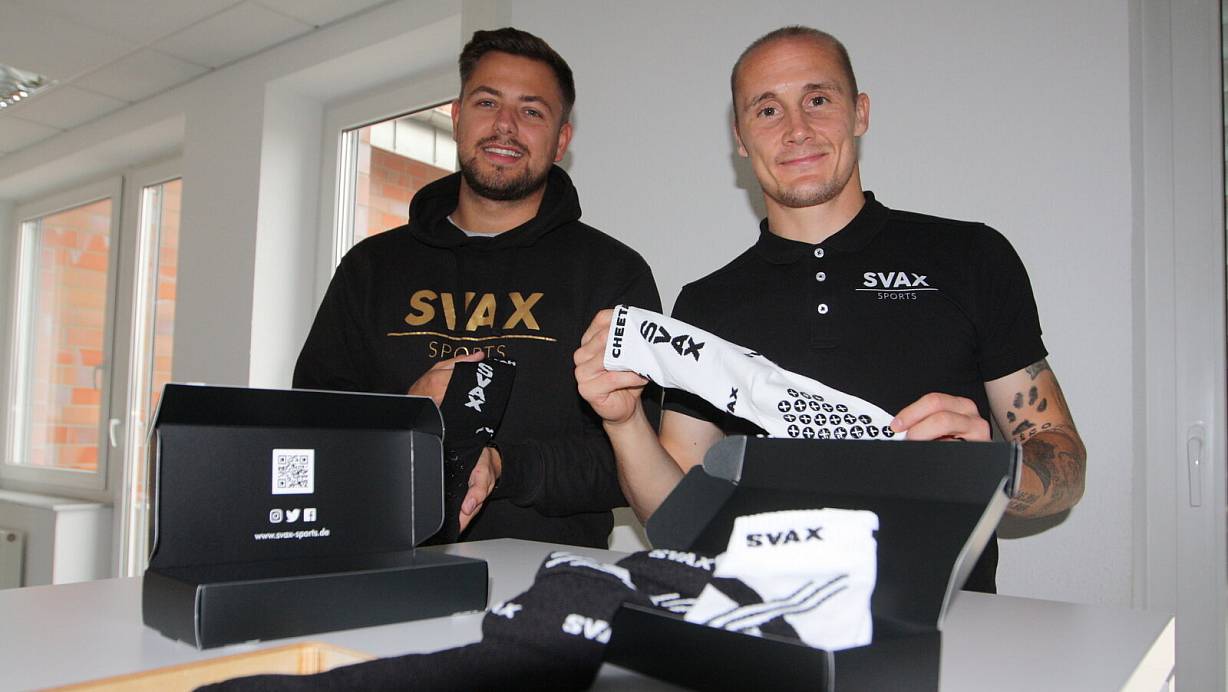 Der Paderborner Maximilian Steinmüller (l.) und Profifußballer Sven Michel haben zusammen ein Start-Up gegründet. Unter dem Firmennamen Svax Sports haben sie Sportsocken entwickelt. | © Uwe Müller