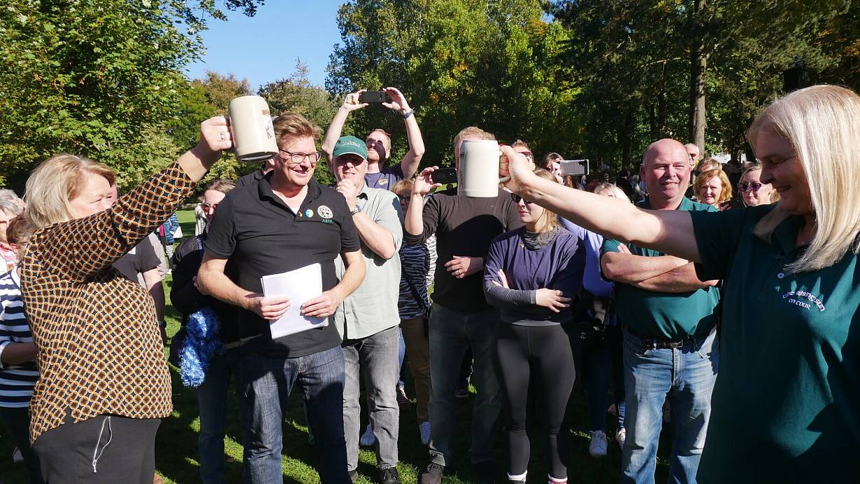 Bei strahlendem Sonnenschein waren Spiel und Spaß im Arminiuspark angesagt. Das Bierkrug-Stemmen - wie hier zu sehen - stellte die Teilnehmer vor einige Herausforderungen. | © Klaus Karenfeld