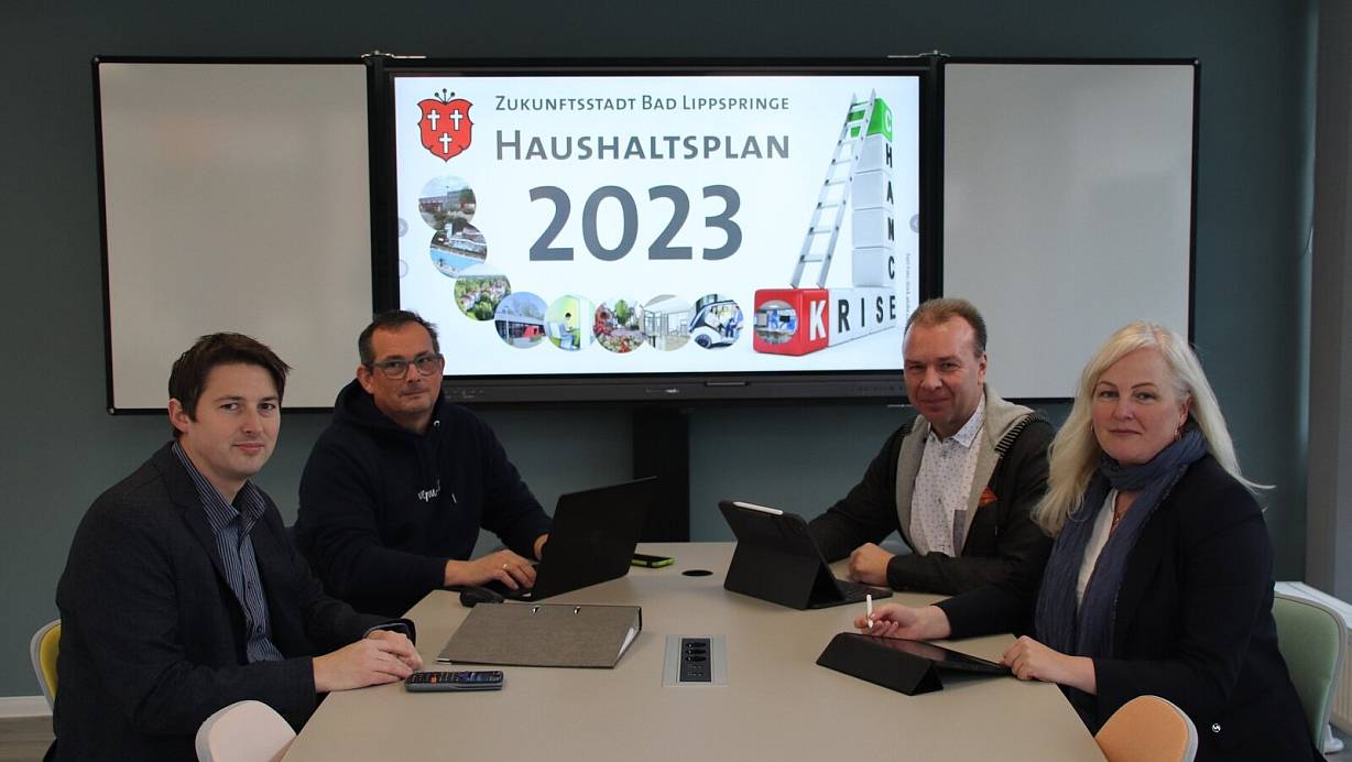 Kämmerer Till Kremeyer (v. l.), Bernd Gehle (allgemeiner Vertreter des Bürgermeisters), Bürgermeister Ulrich Lange und Tanja Berghahn-Macken (Leiterin Stadtentwicklung) haben den Haushaltsplanentwurf für das Jahr 2023 vorbereitet und am Abend in der Ratssitzung vorgestellt. | © Stadt Bad Lippspringe