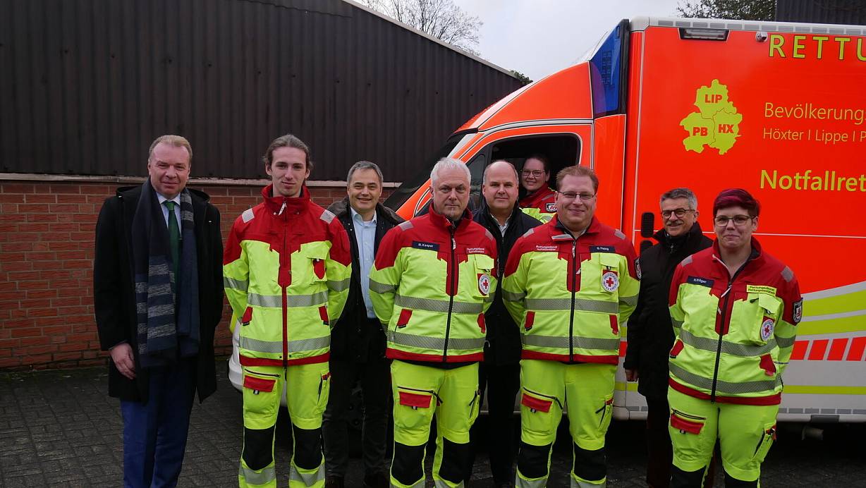 Die Bürgermeister Ulrich Lange (l.) und Marcus Püster (5. v. l.) besuchen die Bad Lippspringer Rettungswache. Jonas Rissiek, Mathias Kasper, Gerrit Fiebig, Nina Kröger, Lena Haß (im Rettungswagen), Stefan Vogel (Geschäftsführer DRK-Kreisverband) und Ulrich Knorr (Vorstand DRK-Bad Lippspringe) sind auch dabei. | © Klaus Karenfeld