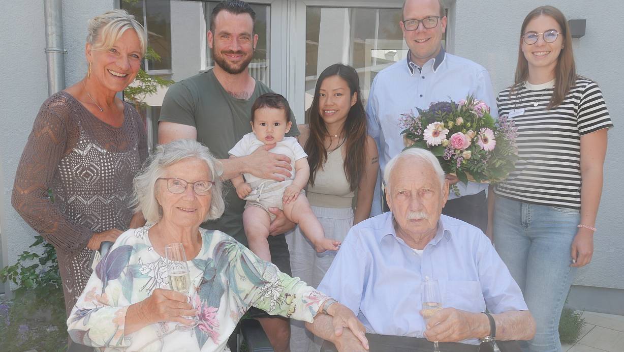 Marianne und Franz Waldmann können heute im Familienkreis das Fest der Eisernen Hochzeit feiern. Mit im Bild: der stellvertretende Bürgermeister Bastian Heggemann (2. v. r.) und Johanna Dembowski, Mitarbeiterin der Jordanquelle (rechts). | © Klaus Karenfeld