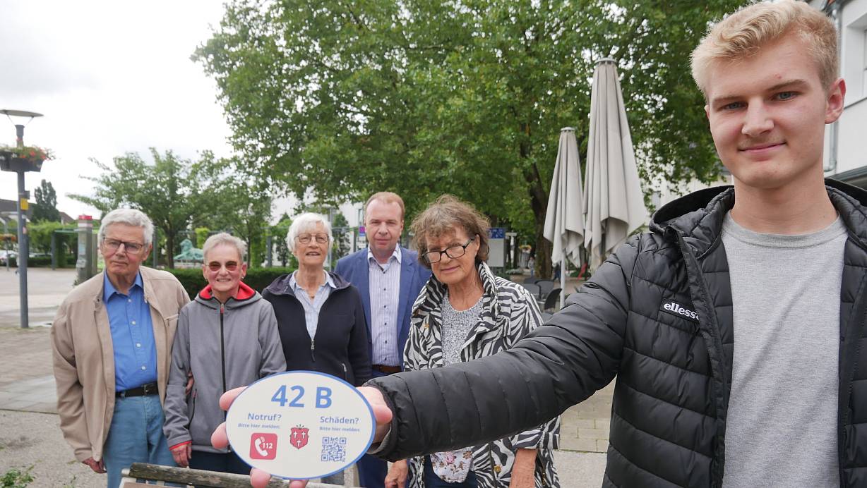 Niklas Bauer (vorne) vom Bad Lippspringer Bauamt präsentiert exemplarisch ein Notfall-Hinweisschild, das sich künftig an allen Sitzbänken im Stadtgebiet befinden soll. Bürgermeister Ulrich Lange sowie Karin Grieser, die Vorsitzende des Seniorenbeirates (2.v.l.) ihr Vorgänger Detlev Seidel (l.) und weitere Beiratsmitglieder freuen sich über die Aktion. | © Klaus Karenfeld