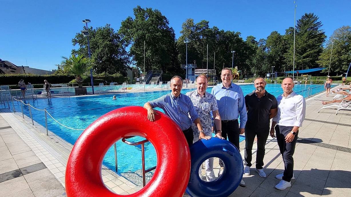 Wie auch im vergangenen Jahr freuen sich Robin Stork (Geschäftsführer der Westfalen-Therme, v. l.), Bürgermeister Ulrich Lange, Norbert Leibold (ebenfalls Geschäftsführer der Westfalen-Therme), Waleri Reglin vom Freibad-Team und Center-Manager Kai Meyer auf viele Freibadbesucher. | © Stadt Bad Lippspringe