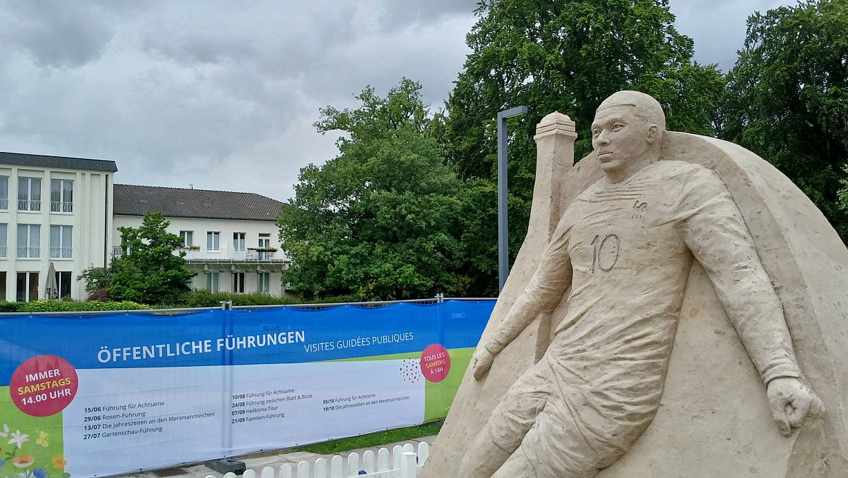Frankreichs Superstar Kylian Mbappé könnte seine Sandskulptur vom Balkon des Parkhotels sehen. | © Uwe Müller